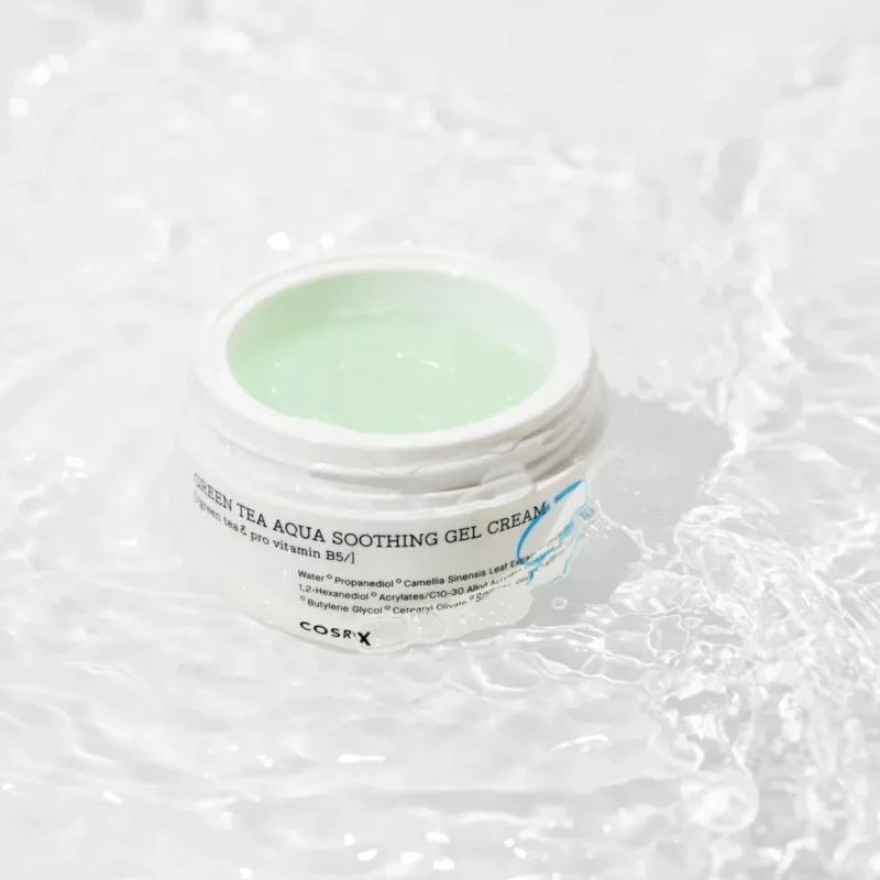 COSRX Hydrium Green Tea Aqua Soothing Gel Cream ir īpaši izstrādāts, lai nodrošinātu intensīvu mitrināšanu un ādas nomierināšanu. Šis gēla krēms satur zaļās tējas ekstraktu, kas ir pazīstams ar savām antioksidanta īpašībām, palīdzot cīnīties ar brīvajiem radikāļiem un samazinot iekaisumu. Tā unikālā formula apvieno mitrinošās īpašības ar hialuronskābi, kas spēj piesaistīt mitrumu no apkārtējās vides, nodrošinot ilgstošu ādas mitrināšanu.