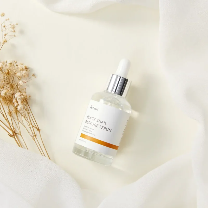 IUNIK Black Snail Restore Serum apvieno bagātīgu sastāvdaļu sastāvu, kas vērsts uz ādas atjaunošanu un mitrināšanu. Šis serums satur 70% melnā gliemeža sekrēta filtrātu, kas ir pazīstams ar savām dziedinošajām īpašībām. Gliemežu sekrēts ir bagāts ar olbaltumvielām, aminoskābēm un hialuronskābi, kas veicina ādas reģenerācijas procesu, uzlabo tās elastību un samazina smalkās līnijas.