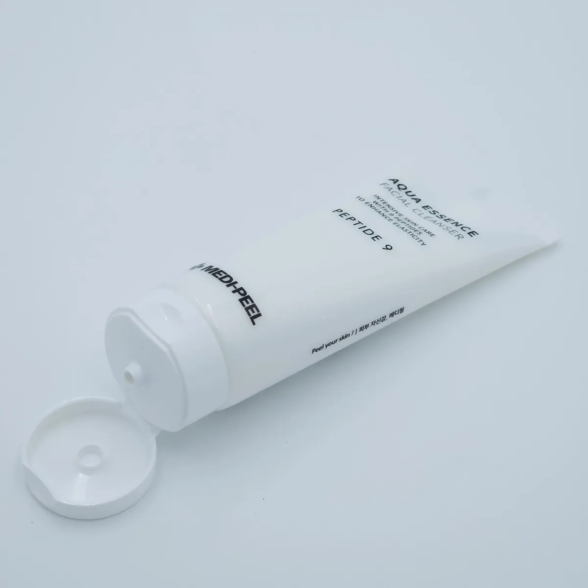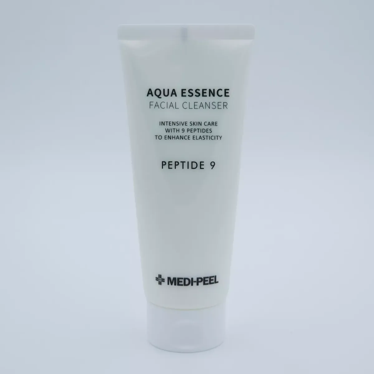 MEDI PEEL Peptide 9 Aqua Essence Facial Cleanser atspoguļo klīniskās ādas kopšanas filozofiju: precīza aktīvo vielu sinerģija, cieņa pret ādas barjeru un skaidri izmērāms rezultāts. Esences tipa gēls veido maigas, ātri izkliedējošas putas, kas šķīdina ikdienas netīrumus un SPF atlikumus, vienlaikus saudzējot lipīdus. Formulas ass ir 9 peptīdu komplekss: signālpeptīdu, transporta peptīdu un strukturālo peptīdu kombinācija, kas palīdz uzturēt epidermas homeostāzi, elastības sajūtu un gludāku ādas atjaunošanos pat īslaicīga kontakta laikā. Tā iedarbību pastiprina humektanti – glicerīns, betaīns, hialuronskābes sāļi – kas piesaista un notur ūdeni raga slāņa matricā.